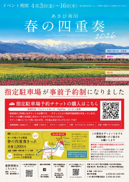 桜並木、色鮮やかなチューリップ、菜の花、そして残雪の山々が織りなす春限定の絶景が楽しめる「あさひ舟川『春の四重奏』2026 」が富山県朝日町で開催中!
